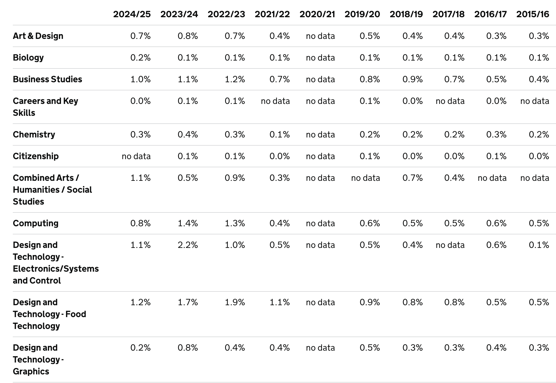 The DfE’s own data shows, once again, that the 'value' of our subject has been called into question. This year, Chemistry has only a 0.2% teacher vacancy rate; Computing has a 0.8% vacancy rate but both subjects retain a bursary of £29K bursary. Geography has 0.8% and will be awarded a £5K bursary. Since 2023 our subject has had a 0.7-0.8%% vacancy rate - i.e. we have not trained sufficient teachers to fill demand – yet still the bursary for art and design trainees has been cut.
