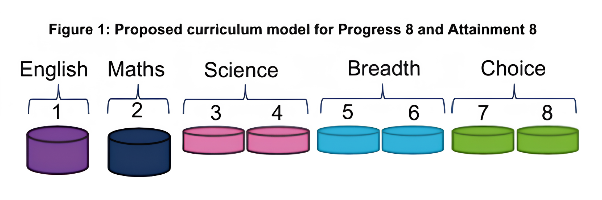 The Government proposes to continue using a slightly modified Progress 8 model based on pupil performance in 8 qualifications, divided into 8 category slots, as illustrated below.